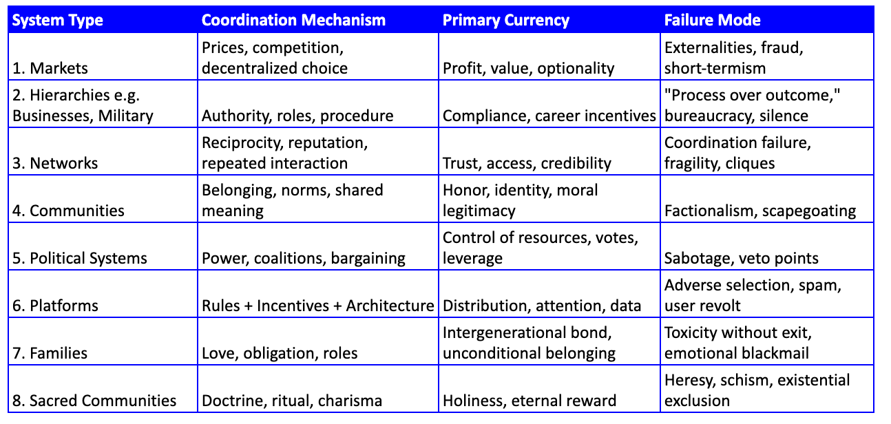 And even within social systems, the rules differ. Markets, bureaucracies, political arenas, and firms do not run on the same mechanics. There are at least 8 kinds of social systems.